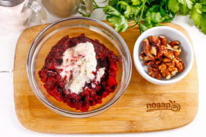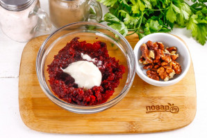 Отварную свеклу натрите на терке с мелкими ячейками в глубокую емкость. Добавьте майонез любой жирности или густую сметану, йогурт любой жирности. По желанию в этот момент можно спрессовать в начинку очищенные зубчики чеснока или всыпать различные специи и пряности.