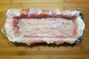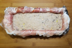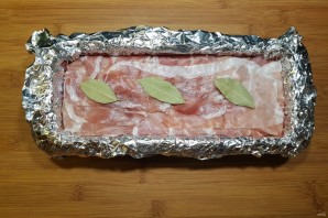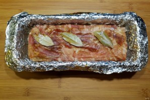 Накройте фарш беконом. Сверху положите лавровые листики.