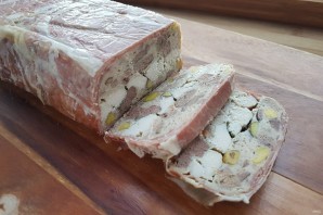 Вкусная закуска для любой компании. Чтобы приготовить вкусный террин к праздничному столу, подготовьтесь заранее, ведь готовить его нужно накануне, так как террин должен вызреть в холодильнике около 12 часов. И хотя для приготовления этого блюда понадобится много времени, сам процесс нельзя назвать сложным. Не забудьте, что запекать террин обязательно нужно, поставив форму в емкость с кипяченной водой