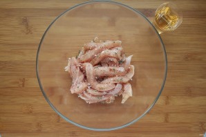 Куриное филе нарежьте тонкими полосками. Добавьте тимьян, соль, перец и вино. Перемешайте и оставьте мариноваться в холодильнике на 3 часа.