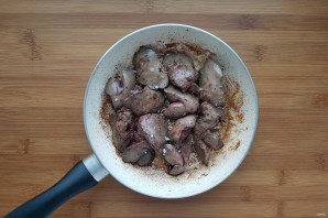 На той же сковороде, где жарился лук, обжарьте печень в течение 5 минут. В конце нужно посолить и поперчить. Когда печень остынет, нарежьте ее кубиками.