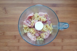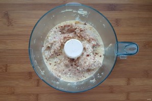 Приготовим фарш. Измельчите в блендере куриные бедра с обжаренным луком.
