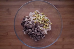 Фарш переложите в миску. Добавьте в него фисташки и нарезанную куриную печень, перемешайте.