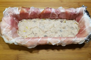 Удлиненную форму для выпечки застелите фольгой. Смажьте маслом и выложите кусочки бекона по всему периметру формы внахлест. Выложите на дно половину приготовленного фарша, утрамбуйте.