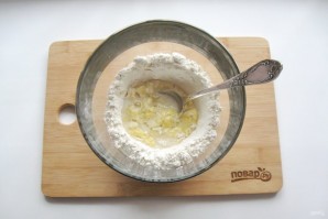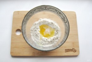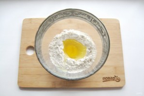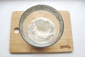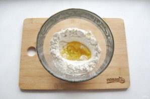 У миску насипте борошно. Зробіть у центрі невелике заглиблення.
