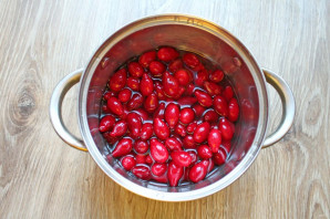 Кизил переберіть, видаливши псувані та зелені ягоди, вимийте і складіть у каструлю. Налийте воду до ягід і поставте на середній вогонь, доведіть до кипіння та варіть протягом 15 хвилин. Зніміть каструлю з плити та охолодіть.
