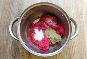 Перекладіть кизилову масу в каструлю з товстим дном, додайте сіль, цукор, спеції та рослинну олію, перемішайте. Якщо маса надто густа, додайте ще трохи відвару до потрібної консистенції. Поставте на повільний вогонь і після перших "бульбашок" варіть 10 хвилин, постійно перемішуючи.