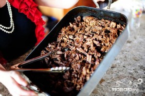 2. Поставить кастрюлю в духовку и готовить 1 1/2 часа. Убрать жаркое из духовки, остудить до комнатной температуры и измельчить на маленькие кусочки. За 30 минут до готовности жаркого смешать лук и перец с оставшимися 2 столовыми ложками масла, посыпать солью и перцем и выложить на большой противень, чтобы овощи поместились в один слой. Запекать около 30 минут.