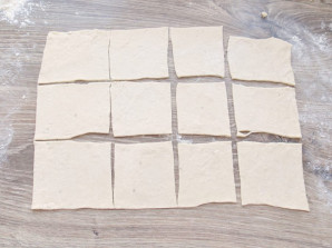 У яєчну масу всипте просіяне борошно і замісіть м'яке тісто. Стіл трохи посипте борошном і викладіть тісто. Розкачайте його у тонкий прямокутник і розріжте на квадрати.