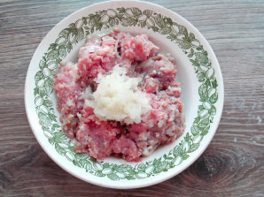 Ріпчастий цибулю натріть на великій тертці, додайте до фаршу. Все посолити, поперчити і добре перемішайте.