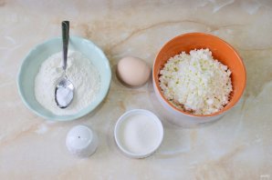 Для приготовления творожных лепешек подготовьте необходимые ингредиенты. Творог можно протереть через сито или оставить с крупинками.