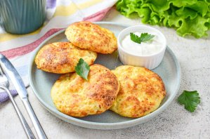 Творожные лепешки очень вкусные в теплом виде со сметаной.
