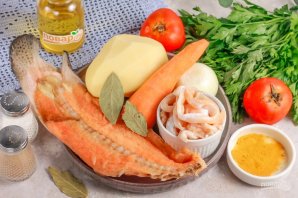 Підготуйте вказані інгредієнти. Очистіть цибулю, моркву, картоплю від шкірки та промийте у воді разом із помідорами. Шматки риби промийте, очистіть від луски, якщо вона є. Можна використовувати голову риби, видаливши зябра та очі.