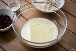В просторную миску залейте молоко, добавьте растительное масло, сахар. Перемешайте.