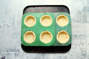 Формочки для выпечки смажьте растительным маслом, выложите по одному кусочку теста и распределите по дну и бокам. Наколите тесто на дне вилкой.
