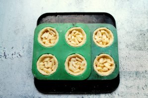 Поверх яблок разложите ягоды голубики. Поставьте ватрушки в горячую духовку и выпекайте при температуре 180 градусов в течение 20-25 минут. Достаньте формочки с ватрушками из духовки, остудите и подавайте.