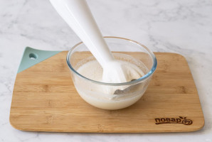 Добавьте в миску с растительным молоком и рисовым уксусом яблочное пюре и растительное масло, взбейте блендером до однородной консистенции.