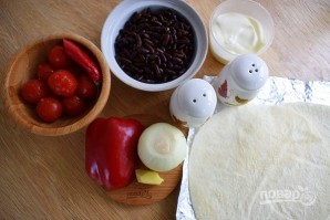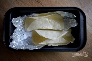 Тортильи сверните пополам, зафиксируйте с помощью фольги и запекайте в духовке в течение 3-4 минут при 180 °C.