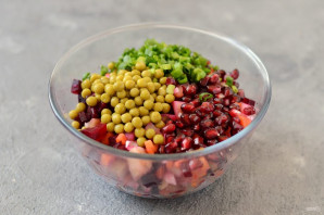 Додайте в миску консервований горошок, зерна гранату та дрібно нарізаний зелений цибулю.