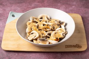 Разогрейте сковороду с растительным маслом на среднем огне. Выложите шампиньоны в один слой. Жарьте их пару минут, пока не выпарится лишняя жидкость и они не станут золотистого цвета, затем переверните и обжарьте со второй стороны.