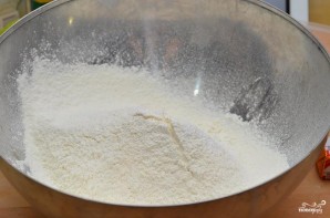 В большой миске смешиваем просеянную муку, разрыхлитель и соль.