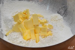К муке добавляем на кубики нарезанное сливочное масло.