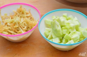 Тем временем, занимаемся яблоками - половину натираем на крупной терке, а половину просто нарезаем на среднего размера кубики.