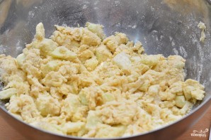 Перекладываем яблоки в мучную смесь, затем добавляем в нее молоко и замешиваем достаточно мягкое тесто.