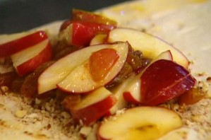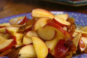 Яблоки нарезаем дольками, сердцевину удаляем. Затем обжариваем яблоки на сливочном масле, присыпав их корицей. Добавляем изюм, вливаем 2 ст. ложки апельсинового сока и готовим до мягкости на медленном огне. После этого, остудите яблоки.