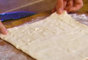 Размороженное пласты теста немного растяните. Один край (до середины) нарезаем широкими полосками, шириной 1,5–2 см.