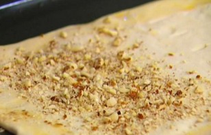 Смазываем противень растительным маслом, кладем на него тесто. Яйцом смазываем края теста. Целую половину теста присыпьте измельченным миндалем.