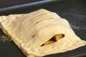 Кладем яблоки и накрываем второй стороной теста (с полосками).