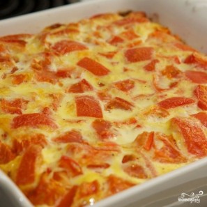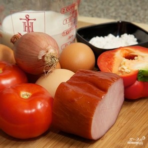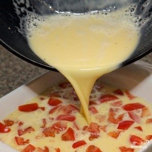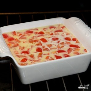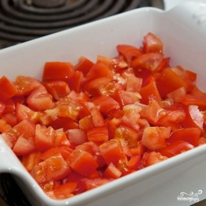 Помідори та перець, очищений від насіння, нарізаємо кубиками і викладаємо у форму для запікання.