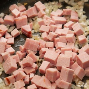 Додаємо нарізаний кубиками бекон і готуємо ще 4-5 хвилин на середньому вогні, перемішуючи.
