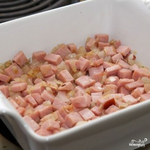 Викладаємо смажений бекон і цибулю в форму для запікання.