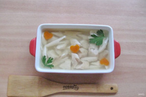 Желатин залейте небольшим количеством холодной, кипяченой воды и дайте набухнуть в течение 10 минут. После выложите в кастрюлю с горячим рыбным бульоном. Перемешивайте до полного растворения желатина. После залейте этим бульоном хек.