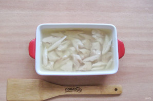 Разберите хек на небольшие кусочки, удаляя косточки и шкурку. Выложите в форму для заливного.