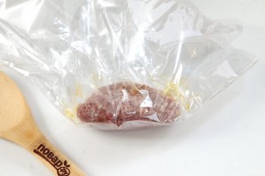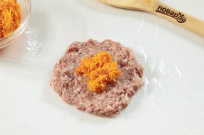 Розділіть фарш на 8 частин. На харчовій плівці (у мене — рукав для запікання) сформуйте плоску лепешку і покладіть у середину приблизно чайну ложку морквяної начинки.