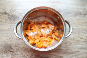 Абрикосы вымойте, обсушите и удалите косточки. Порежьте на кусочки и выложите их в кастрюлю с толстым дном. Насыпьте 100 грамм сахара, накройте крышкой и поставьте на сильный огонь.