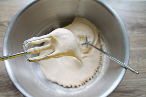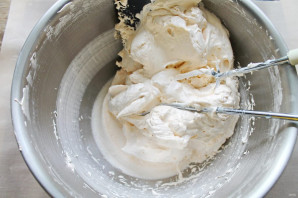 Тонкой струйкой вливайте в чашу с абрикосовой массой, взбивая на высокой скорости. Взбивайте до стабильной, плотной массы. Она должна хорошо держать форму.