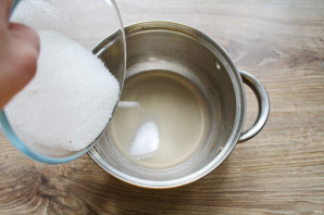 Вылейте замоченный агар-агар в кастрюлю с толстым дном и поставьте на медленный огонь. Доведите до кипения и всыпьте сразу весь сахар. Варите на медленном огне в течение 4-5 минут до температуры 110 градусов. Снимите и дайте постоять 2-3 минуты.