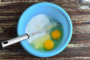 В миску вбейте куриные яйца и всыпьте к ним сахар.