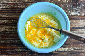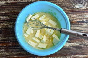 Добавьте сливочное масло комнатной температуры, которое нарежьте на более мелкие кусочки.