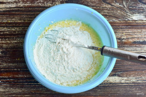 Муку соедините с разрыхлителем, хорошо все перемешайте и добавьте к яично-масляной массе.