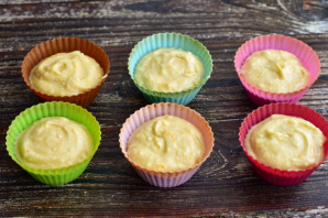 Хорошо перемешайте тесто и разложите его ложкой по силиконовым формочках, наполняя их чуть больше половины.