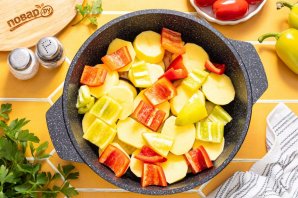 Прижмите овощи тарелкой, накройте крышкой и доведите до кипения. Тушите 45-50 минут на умеренном огне. Ориентируйтесь на готовность картофеля. Овощи должны дать много сока и стать мягкими.