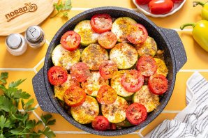 Помидоры нарежьте крупными кубиками или кружочками. Посолите, поперчите, добавьте все специи. На дно влейте немного воды (примерно 50 мл.), сверху полейте овощи растительным маслом.