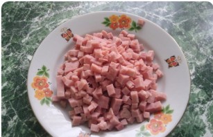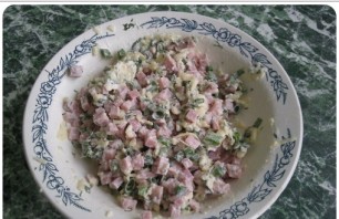 7. Смешиваем сметану с ветчиной, сыром, луком и зеленью. Можно посолить и добавить приправы.