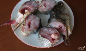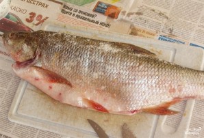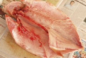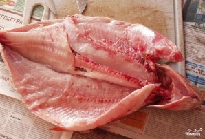 Рыбу почистите и выпотрошите. Отрежьте ей хвост, разрежьте с двух сторон по хребту изнутри.