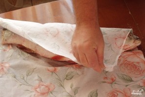 Теперь заверните рыбу в чистую тряпку.